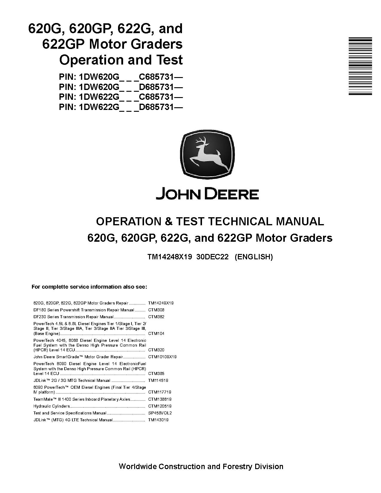 John Deere 620G, 620GP, 622G and 622GP Motor Graders (SN. from C685731, D685731) Operation and Test Manual (TM14248X19)