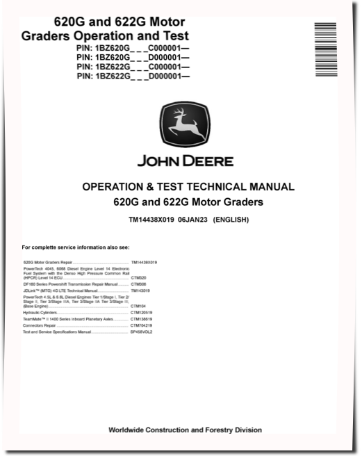 John Deere 620G and 622G Motor Graders (SN. from C000001, D000001) Operation and Test Manual (TM14438X019)