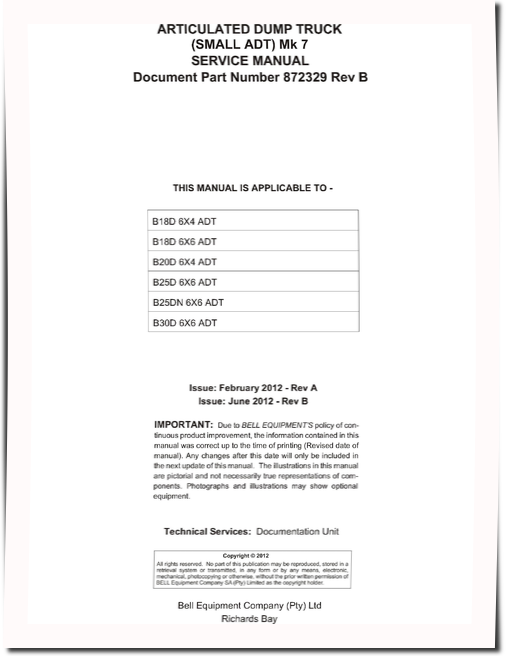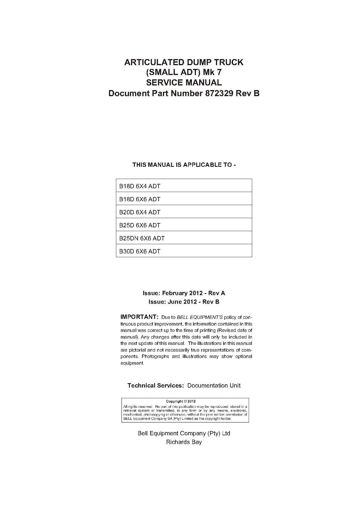 BELL B18D 6X4, B18D 6X6, B20D 6X4, B25D 6X6, B25DN 6X6 and B30D 6X6 MK7 Articulated Dump Trucks Service Manual (872329)