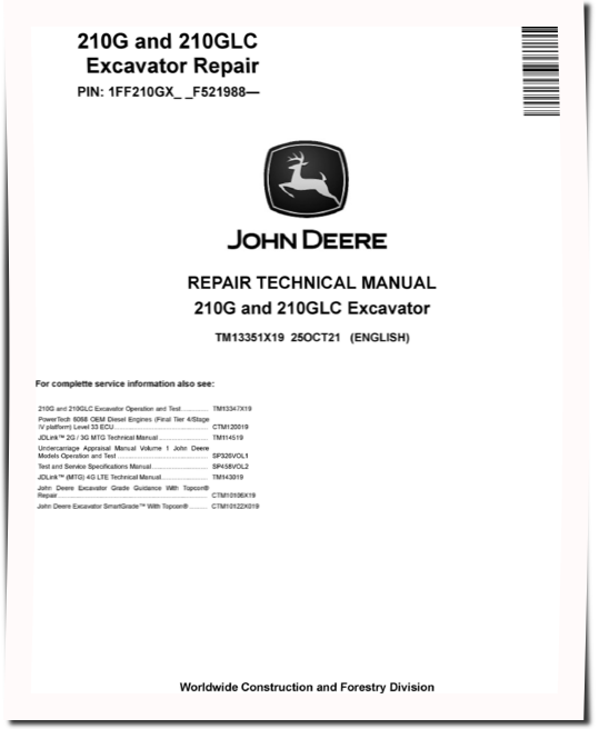 John Deere 210G and 210GLC (SN. from F521988) Crawler Excavators Repair Manual (TM13351X19)