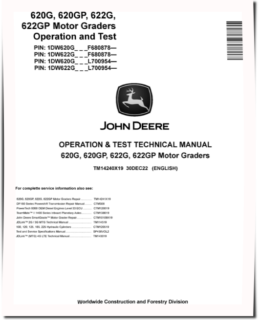 John Deere 620G, 620GP, 622G and 622GP Motor Graders (SN. from F680878, L700954) Operation and Test Manual (TM14240X19)