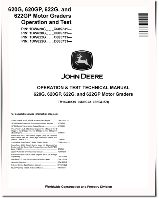 John Deere 620G, 620GP, 622G and 622GP Motor Graders (SN. from C685731, D685731) Operation and Test Manual (TM14248X19)