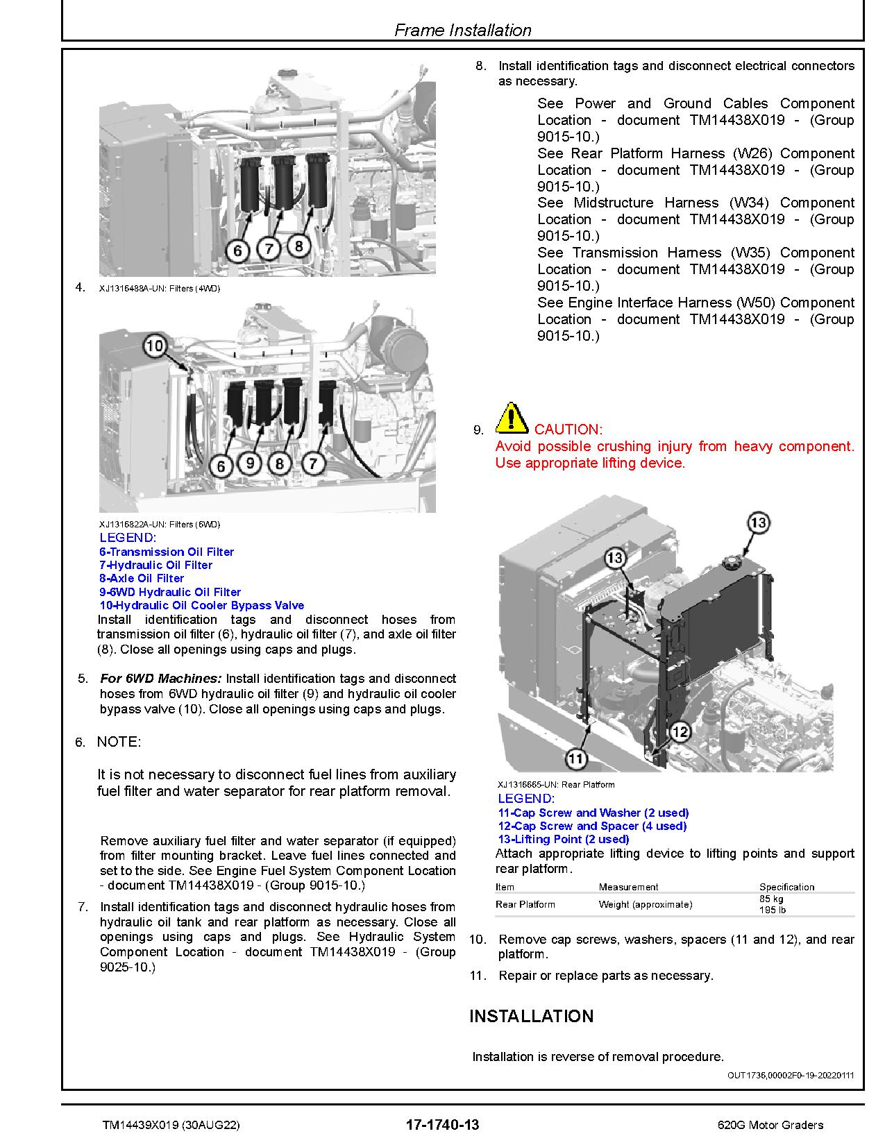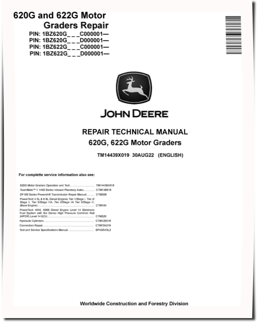 John Deere 620G and 622G Motor Graders (SN. from C000001, D000001) Repair Manual (TM14439X019)